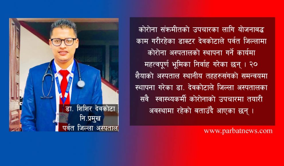 कोरोना संक्रमीतको उपचारका लागि योजनाबद्ध काम गरीरहेका डाक्टर देवकोटाले पर्वत जिल्लामा कोरोना अस्पतालको स्थापना गर्ने कार्यमा महत्वपूर्ण भूमिका निर्वाह गरेका छन् । अस्पतालमा वेड संख्या थपेर ५० शैयाको बनाउने उनको योजनामा भने पछिल्लो समय यथेष्ट सहयोग नमिलेको देखिन्छ । २० शैयाको अस्पताल स्थानीय तहहरुसंगको समन्वयमा स्थापना गरेका डा. देवकोटाले जिल्ला अस्पतालका सवै स्वास्थ्यकर्मी कोरोनाको उपचारमा तयारी अवस्थामा रहेको बताउँदै आएका छन् ।