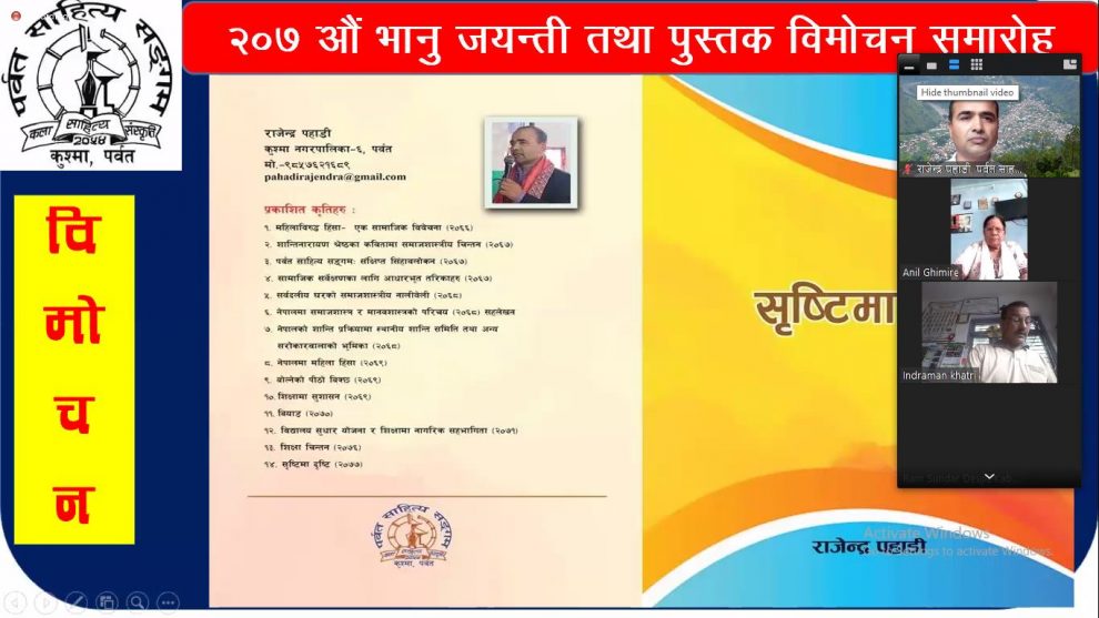 ३० असार, पर्वत । २०७ औं भानुजयन्तीको सन्दर्भमा पुस्तक विमोचन तथा सृजना वाचन कार्यक्रम सम्पन्न भएको छ । पर्वत साहित्य सङ्गमको आयोजनामा जुम एप्लिकेशनको माध्यमबाट सम्पन्न गरिएको कार्यक्रममा साहित्यकार राजेन्द्र पहाडीको नवीनतम समालोचना कृति ‘सृष्टिमा दृष्टि’ को प्रमुख अतिथि सहप्राध्यापक डा. षडानन्द पौड्यालले सार्वजनिकीकरण गरेका हुन । विमोचित कृतिका बारेमा पर्वत साहित्य संगमका निवर्तमान अध्यक्ष इन्द्रमान खत्रीले समीक्षात्मक टिप्पणी गरेका थिए ।