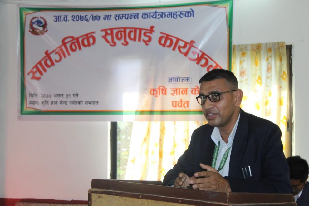 ३१ असार, पर्वत । कृषि ज्ञान केन्द्र, पर्वतले आर्थिक वर्ष २०७६/७७ मा सम्पन्न कार्यक्रमहरुको सार्वजनिक सुनुवाई सम्पन्न गरेको छ । आर्थिक वर्ष २०७६/७७ को स्वीकृत वार्षिक कार्यक्रम अन्तर्गत कृषि ज्ञान केन्द्र, पर्वतले केन्द्रीय सरकार र प्रदेश सरकारबाट प्राप्त बजेट मध्ये ८९।३५ प्रतिशत अर्थात ९० प्रतिशत प्रगति हासिल गर्न सफल भएको छ ।