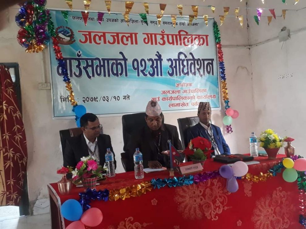 ११ असार, पर्वत । जिल्लाको जलजला गाउँपालिकाको आर्थिक बर्ष ०७९/०८० को बजेट, नीति तथा कार्यक्रम सर्बसम्मत पारित भएको छ । शुक्रबार बसेको १२ औ गाउँसभाले अध्यक्ष राजु आचार्यले पेश गर्नुभएको नीति तथा कार्यक्रम र उपाध्यक्ष दिपक आचार्यले पेश गरेको बजेट पारित भएको हो ।