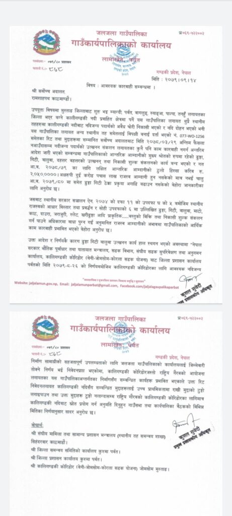 गाउँपालिकाले सर्वोच्च अदालतलाई पत्र लेख्दै नदी उत्खनन् नहुँदा गाउँपालिकामा आम्दानी रोकिएको र कालीगण्डकी करिडोर आयोजनाको निर्माण कार्य प्रभावित भएको कुरा उल्लेख गरिएको छ ।