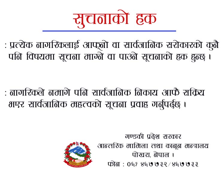 ९ जेठ, पर्वत । जिल्लाको मोदी गाउँपालिकामा सार्वजनिक सुनुवाई कार्यक्रम सम्पन्न भएको छ । गाउँपालिकाले चालु आर्थिक बर्षको अन्तिम चौमासिकका लागि सार्वजनिक सुनुवाई कार्यक्रमको आयोजना गरेको हो । गाउँपालिकाको वडा न ६ तिलाहारमा आयोजीत सार्वजनिक सुनुवाई कार्यक्रमका सहभागीहरुलाई गाउँपालिकालाई ७६ वटा प्रश्न सोधेका थिए । गाउँपालिकाको सडक, शिक्षा, स्वास्थ्य, फोहोर मैलाको ब्यवस्थापन, विद्युत, कर्मचारी प्रशासन, सेवा प्रवाह लगाएतका विषयहरुमा सहभागीहरुले प्र्रश्न सोधेका थिए ।
