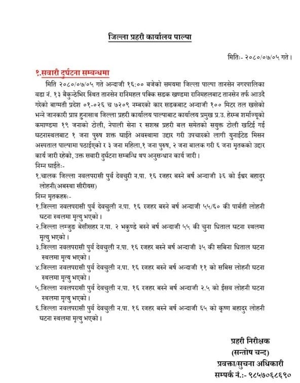 दुर्घटनामा ज्यान गुमाउनेमा तीन महिला, दुई बालक र एक पुरुष रहेका छन् । ज्यान गुमाउनेको परिचय नखुलेको पाल्पा प्रहरीले जनाएको छ ।घटनास्थलमा नेपाल प्रहरी, सशस्त्र प्रहरी र नेपाली सेनाको टोली उद्वारका लागि खटिएको छ ।