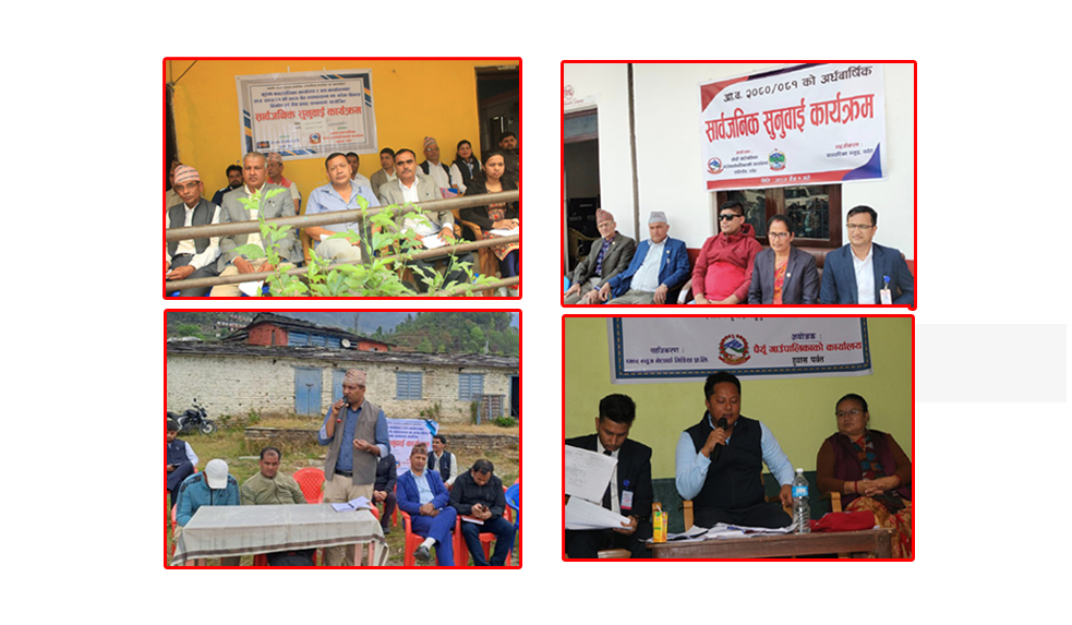 पहिलो कार्यकालमा सार्वजनिक सुनुवाई नगरेको कुश्मा नगरपालिका यस पटक सवै वडामा पुगिरहेको छ । नगरपालिकाका प्रमुख उपप्रमुख र सम्बन्धित वडाअध्यक्षहरुले कार्यालयका विषयगत शाखा प्रमुखहरु लिएर जनगुनासो सुन्न वडास्तरीय सार्वजनिक सुनुवाई कार्यक्रम गरीरहेका छन् । जनताका गुनासा सुन्ने, सुझाब ग्रहण गर्ने र प्रश्नको उत्तर दिने अयिभानमा कुश्मा नगरपालिका जुटिरहेको छ । नगरप्रमुख रामचन्द्र जोशीले सवै वडाहरुमा बडाबासीहरुको उत्साहजनक उपस्थितीमा अन्तरक्रियात्मक रुपमा सार्वजनिक सुनुवाई कार्यक्रम अघि बढेको बताउँछन् ।