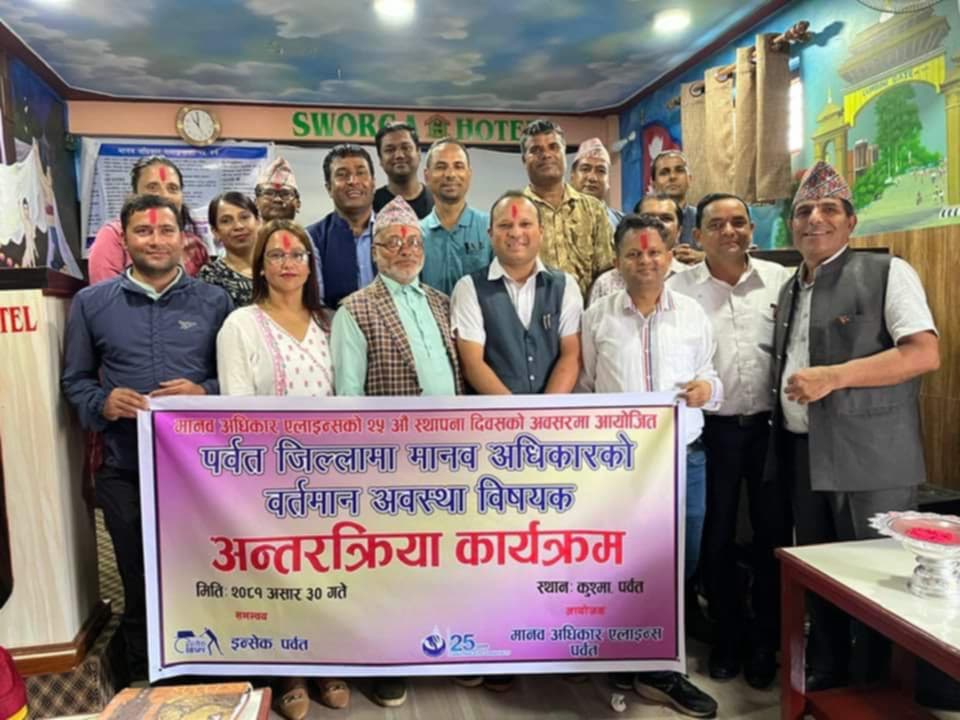 यसैवीच मानवअधिकार एलायन्स पर्वतको आयोजना तथा इन्सेक पर्वतको समन्वयमा असार ३० गते पर्वतमा मानवअधिकारको अवस्था सम्बन्धि अन्तरक्रिया कार्यक्रम सम्पन्न भएको छ । मानवअधिकार एलायन्सको २५ औँ स्थापनाको दिवसमा पर्वतमा उक्त कार्यक्रम आयोजना भई सम्पन्न भएको हो ।