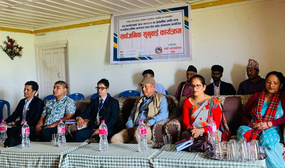 ४ जेठ, पर्वत । जिल्लाको मोदी गाउँपालिकाका सवै वडाहरुमा सार्वजनिक सुनुवाई कार्यक्रम सम्पन्न भएको छ । गाउँपालिकाले चालु आर्थिक बर्षको समिक्षा तथा आगामी आर्थिक बर्षको योजना छनौटका विषयमा वडास्तरमा सार्वजनिक सुनुवाई कार्यक्रमको आयोजना गरेको हो । गाउँपालिकाका ८ वटा वडाहरुमा आयोजीत सार्वजनिक सुनुवाई कार्यक्रममा स्थानीयले गाउँपालिकासंग प्रश्नोत्तरसंगै सुझाबहरु समेत दिएका थिए । गाउँँपालिकाले चालु आर्थिक बर्षमा सञ्चालन गरेका योजनाहरु तथा कार्यक्रमसंगै सार्वजनिक सुनुवाई कार्यक्रममा सेवा प्रवाहका विषयमा समेत सहभागीले आफ्नो धारणा राखेका थिए ।