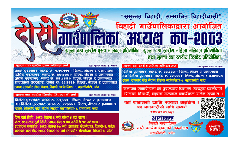 २५ चैत, पर्वत । जिल्लाको विहादी गाउँपालिकामा दोस्रो अध्यक्ष कप प्रतियोगीताको आयोजना गरिएको छ । गाउँपालिकाले आगामी वैशाख ७ गते देखि गाउँपालिकामा दोस्रो अध्यक्ष कप प्रतियोगीताको आयोजना गरेको हो । वैशाख १२ गतेसम्म सञ्चालन हुने उक्त प्रतियोगीतामा खेलक्षेत्रका विभिन्न विधाका खेलहरु समावेश गरिएका छन् ।