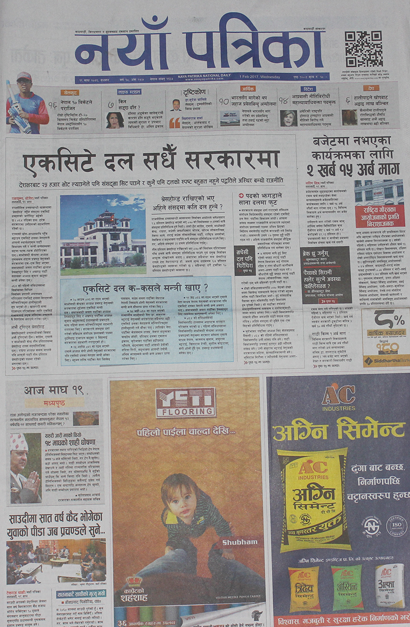 नयाँ पत्रिका दैनिकले एक सिट मात्रै भएका साना दल सधैं सरकारमा पुग्ने गरेको समाचारलाई मुख्य समाचार बनाएको छ । त्यस्तै, बजेटमै नभएका कार्यक्रमका लागि मन्त्रालयहरुले २ खर्ब १५ अर्ब रुपैयाँ माग गरेको समाचारलाई महत्व दिएर फ्रन्टपेजमा छापेको छ ।
