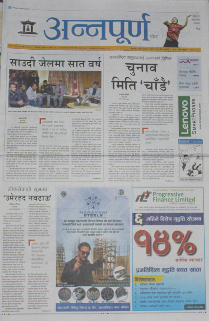 नागरिक दैनिकले ‘चुनाव रोक्न बाहृय दबाव’ शीर्षकको समाचारलाई महत्व दिएको छ । त्यस्तै असाबधानीले आगलागीको घटना बढेको समाचारले पनि फ्रन्टपेजमा स्थान पाएको छ ।अन्नपूर्ण पोस्ट् दैनिकले साउदीको जेलमा सात वर्ष बसेर नेपाल फर्किएका नेपालीहरुको कथालाई महत्वका साथ प्रकाशित गरेको छ । त्यस्तै सरकारले अन्तर्राष्ट्रिय समुदायलाई छिटै चुनाव हुने बताएको समाचारलाई प्राथमिकता दिएको छ ।
