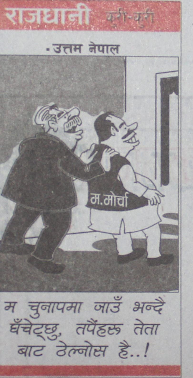 २० माघ, काठमाडौं । राजधानी दैनिकले प्रधानमन्त्री पुष्पकमल दाहाललाई मधेशी मोर्चाको सहमतिमा चुनाव घोषणा गर्न कठिन भएको विषयमा ब्यंग्य गर्दै कार्टुन छापेको छ ।