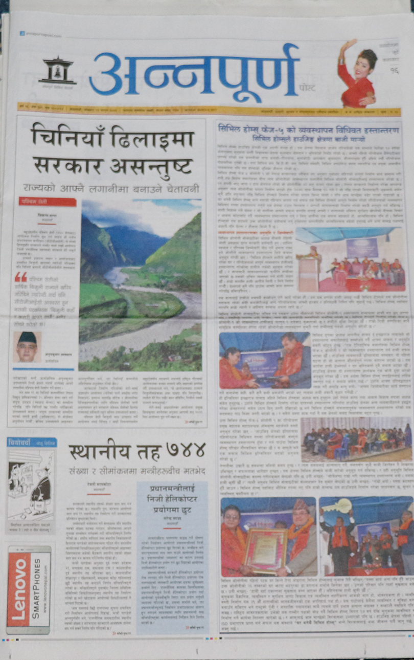 यससँगै नयाँ पत्रिका दैनिकले तीन सय ३८ गाविसमा अझै सडक नपुगेको समाचारलाई महत्व दिएको छ । पश्चिम सेती बहुउद्देश्यीय आयोजना निर्माणमा चिनियाँले ढिलाई गर्दा सरकार असन्तुष्ट भएको भएकोलाई अन्नपूर्ण पोस्ट् दैनिकले मुख्य समाचार बनाएको छ ।