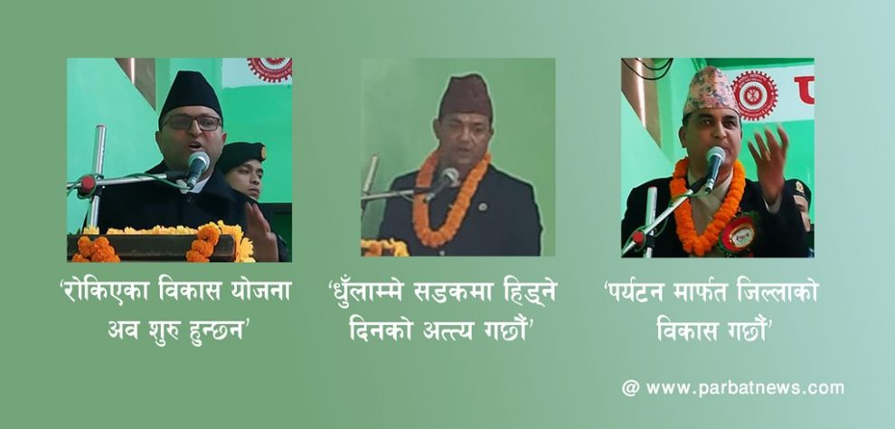 शनिवार पर्वत सदरमुकाम कुश्मा बजारमा ब्यवसायीहरुको एक कार्यक्रममा सहभागी थिए अध्यक्ष तिमिल्सीना, मन्त्री लम्साल र सांसद गिरी । तत्कालीन नेकपा एमालेका ३ वटै नेता अहिले संघ र प्रदेशको निर्णायक तहमा छन । उनीहरुको एउटै प्रतिबद्धता थियो–‘२५ बर्षमा नभएको विकास पर्वतमा अव हुन्छ ।’
