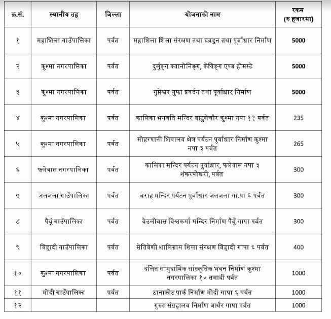 १९ जेठ, पर्वत । पर्वत जिल्लाको पर्यटन पूर्वाधार क्षेत्रमा कुल १ करोड ९८ लाख बजेट विनियोजन भएको छ । आगामी आर्थिक बर्षका लागि पर्वतका विभिन्न पर्यटकीय पूर्वाधार...