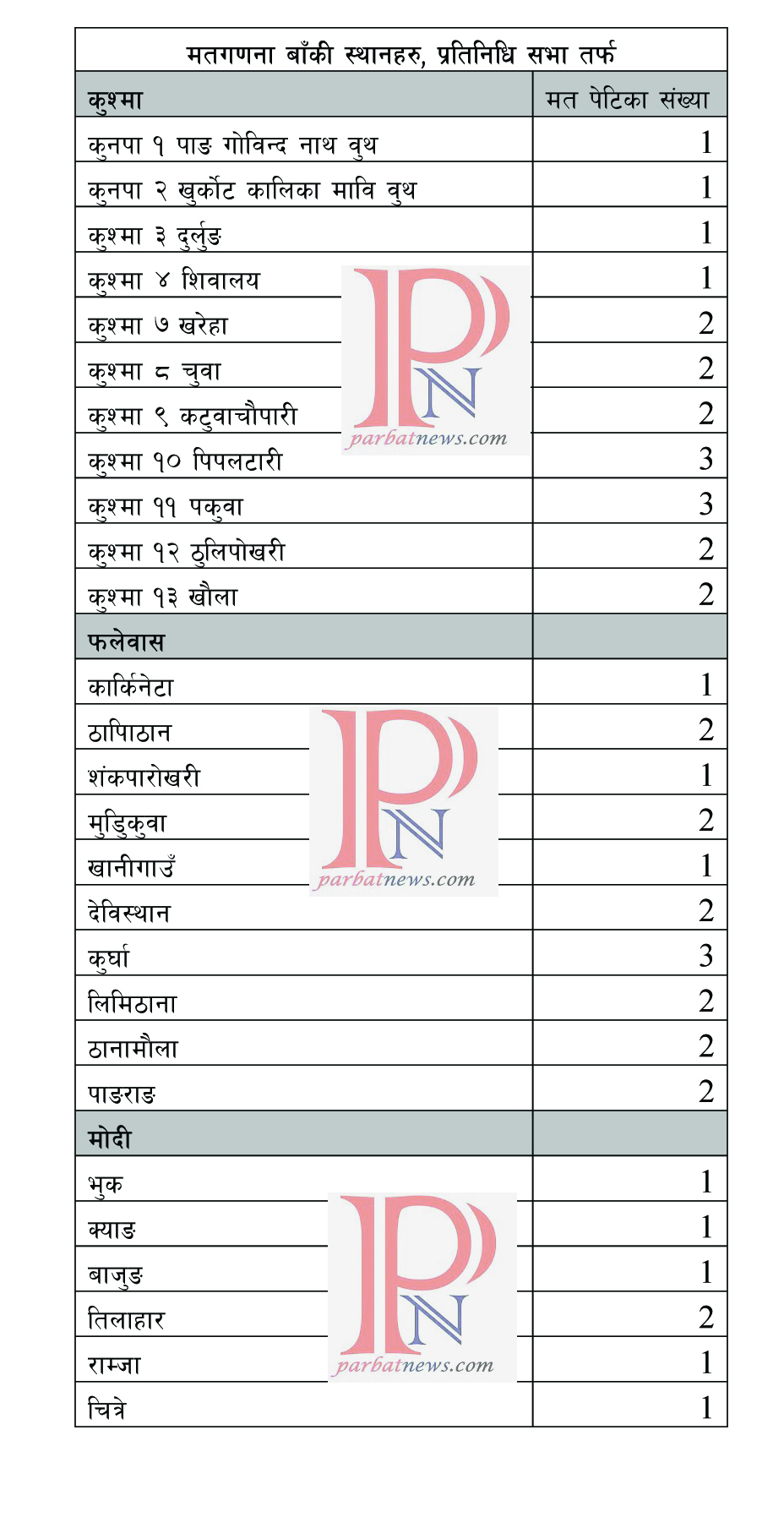 ७ मंसीर, पर्वत । जारी प्रतिनिधि सभा तथा प्रदेश सभा निर्वाचनको मत परिणाम आउने क्रम जारी छ । पर्वत जिल्लामा जारी मतगणना अनुसार अहिले प्रतिनिधि सभा र प्रदेश सभाका...