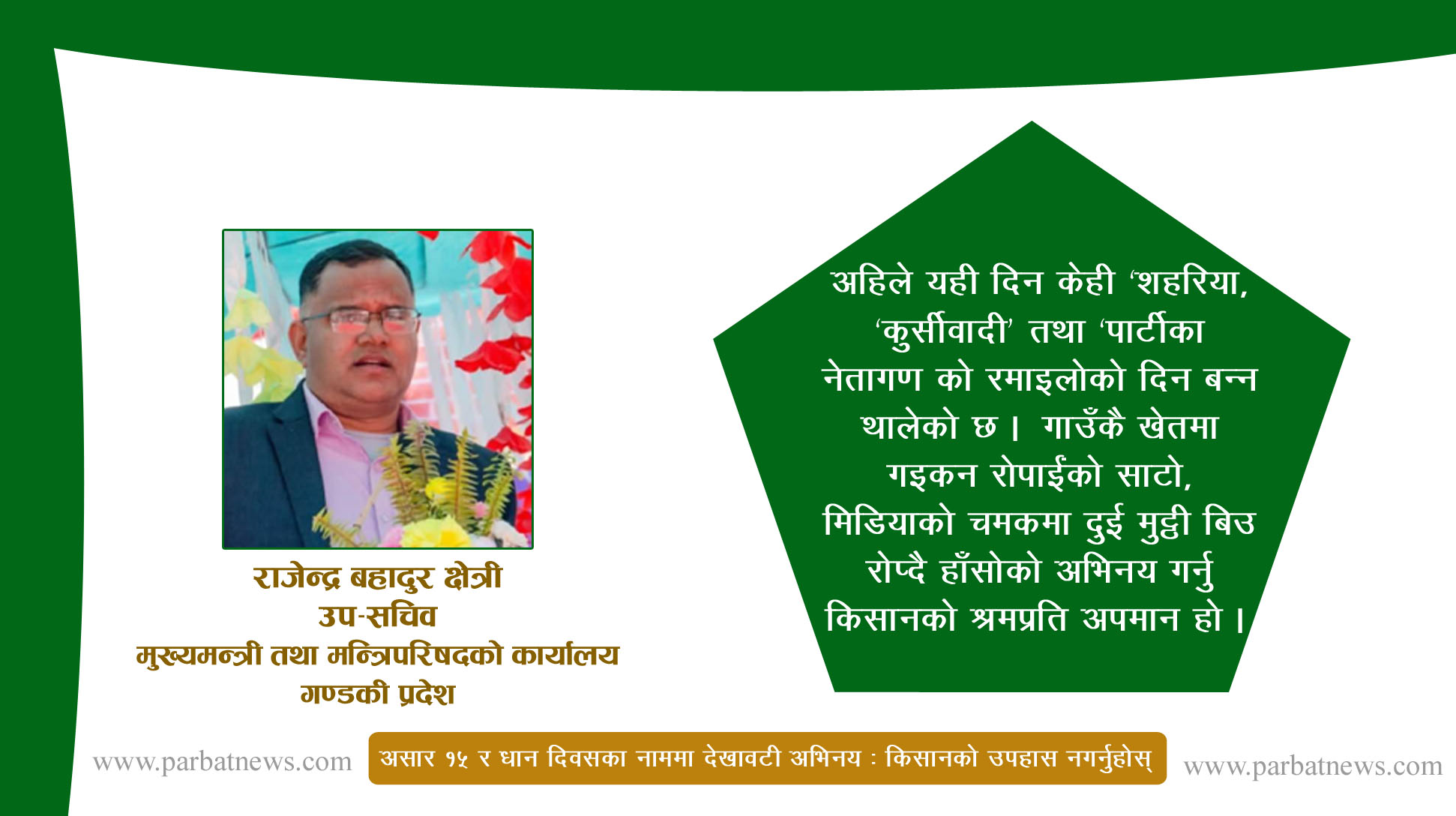 नेपाल कृषि प्रधान देश हो । यहाँको झण्डै ६० प्रतिशत भन्दा बढी जनसंख्या प्रत्यक्ष वा अप्रत्यक्ष रूपमा कृषि पेशामा संलग्न छन् । तर विडम्बना ! कृषि र किसानको...
