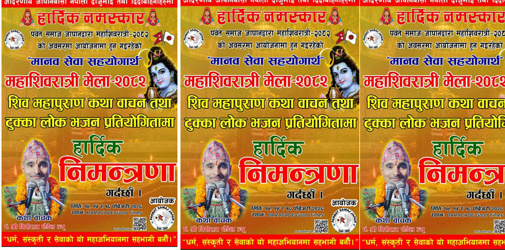 २८ माघ, पर्वत । मानव सेवा (अशक्त तथा असहाय व्यक्तिहरूको सहयोगार्थ) पर्वत समाज जापानद्वारा महाशिवरात्रि विशेष कार्यक्रम आयोजना गर्ने भएको छ । पर्वत समाज जापानको...